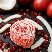 Saldums no granātābolu sulas, ar lazdu riekstu krēma pildījumu, apbērts ar kokosa skaidiņām. Pastilas garša atgādina maigu, vaniļas zefīru. Saldu lukumu cienītājiem!