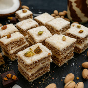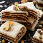 Kārtains vaniļas-šokolādes baudījums. Zem kokosa pārkaisījuma slēpjas vaniļas spilventiņš ar šokolādes krēmu "nutella". Iekšā ir lieli pistāciju gabaliņi. Pistāciju gabaliņi ir viegli apcepti, ar ļoti vieglu sāļu pēcgaršu, maigi un kraukšķīgi. Šokolādes slānis ir biezs un ļoti gards. Lukums izskatās pēc mazas kūciņas!